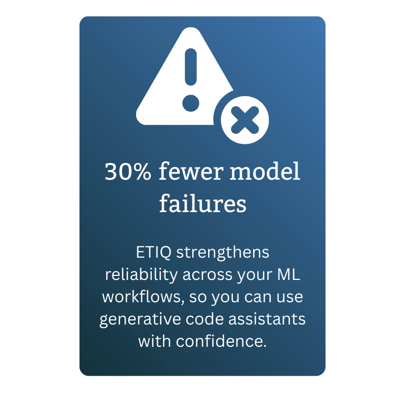 Auto-generated documentation satisfies governance and regulatory requirements for model validation and audit trails. Verified fixes mean fewer errors reaching production. And because Etiq runs locally and works offline, it meets the security standards of financial services, insurance, and other regulated industries without compromise.